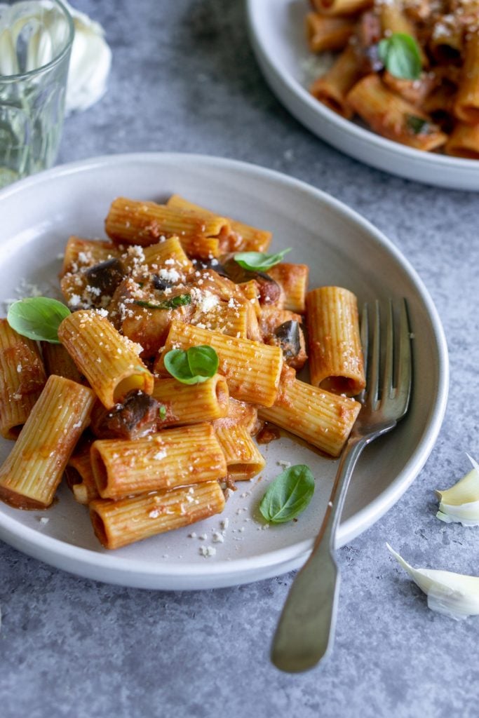 This eggplant pasta is made with fresh eggplant, rigatoni, tomato sauce and mozzarella. An easy and quick lunch or dinner!